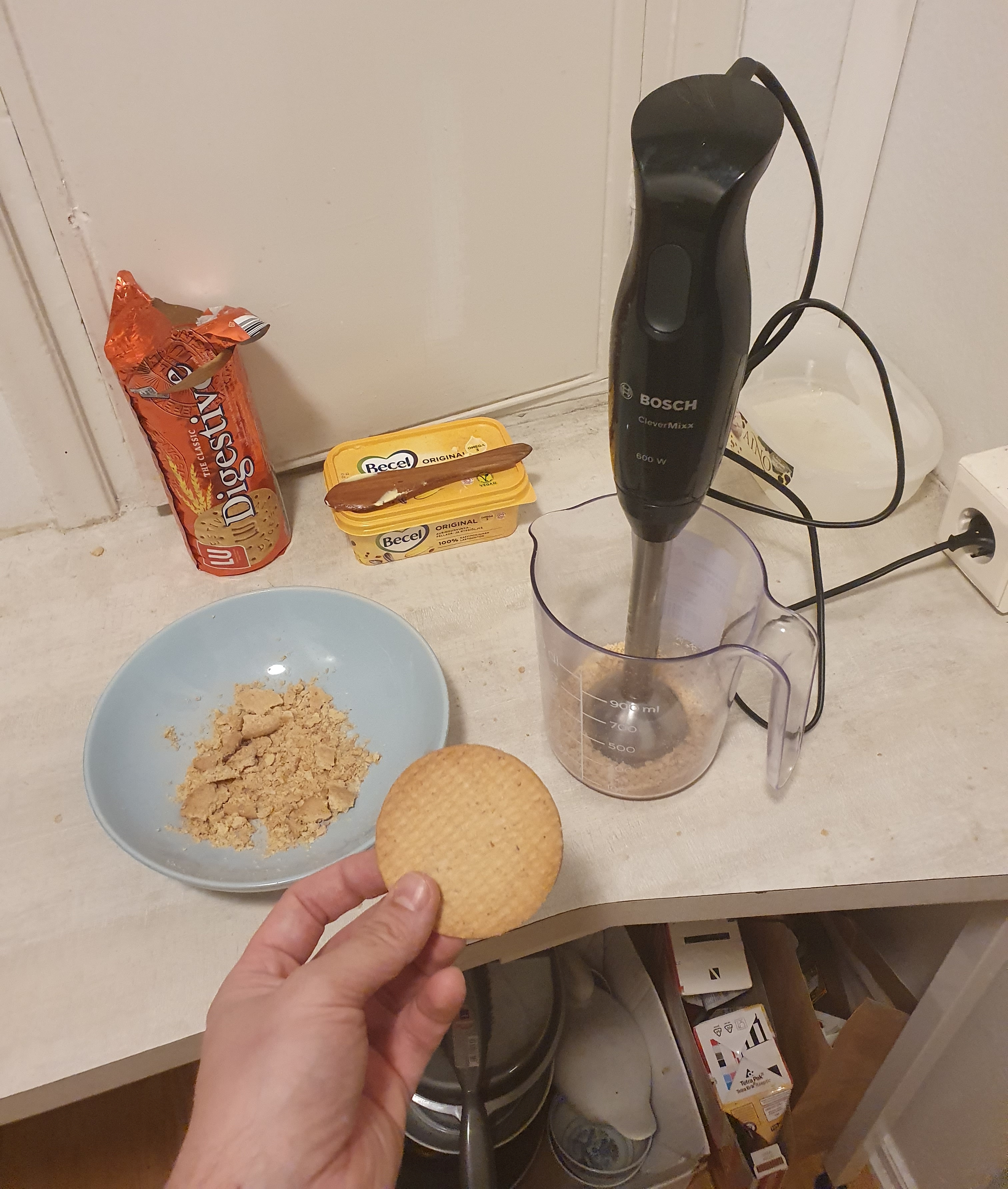 -Murenna keksit muruiksi (älysin, että koneella on helpompi kun käsin) ja nypi rasva joukkoon.